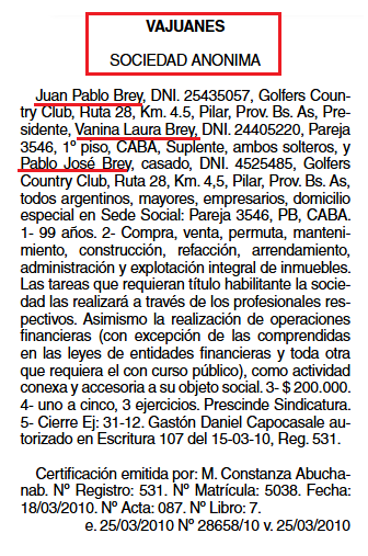 A esto se suma que el propulsor de la candidatura del pastor Gebel, preside Vajuanes SA.  Empresa familiar dedicada a la compra, venta y explotación de inmuebles, donde participan nuevamente su padre Pablo José y su hermana Vanina Brey, vinculada con Aerolíneas Argentinas.