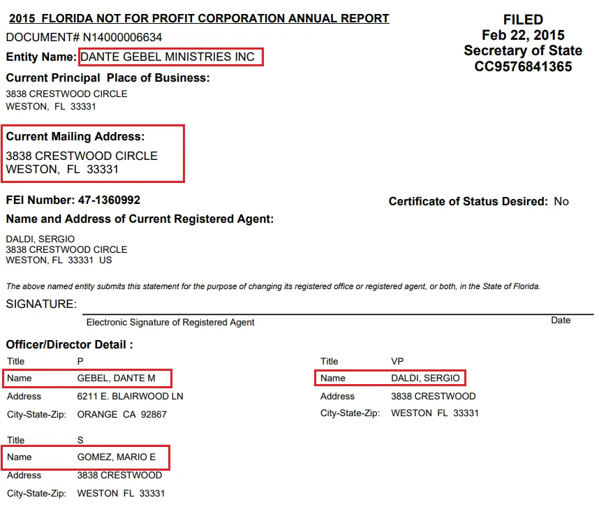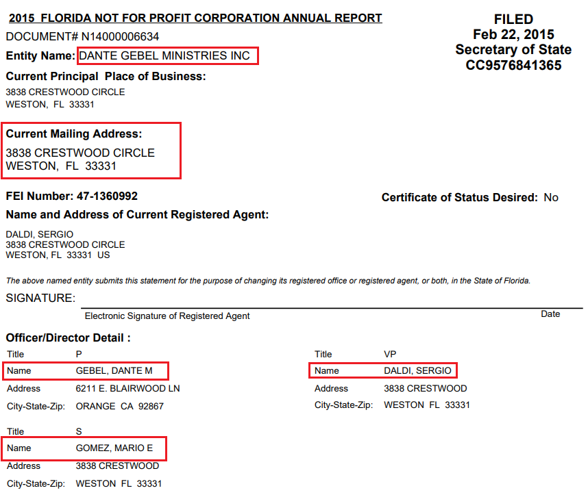 A pesar de la prédica cristiana de Gebel y Daldi, y de su prédica de transparencia, la fundación DANTE GEBEL MINISTRIES INC fue —una vez más— disuelta administrativamente por el Estado de Florida el 25 de septiembre de 2015, por no presentar su Reporte Anual. Es decir, estar floja total de papeles. ¿Esta es la transparencia de la que habla el candidato Gebel?