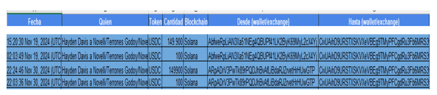 A partir de los datos aportados por las plataformas de exchange, fue identificada una billetera virtual que recibió transferencias por 300.000 USDC (la stable coin de Binance, cuyo valor es cercano a 1 dólar por unidad). Fue en cuatro pagos, entre el 19 y el 30 de noviembre, es decir un poco antes y después de la reunión de Davis con el presidente.