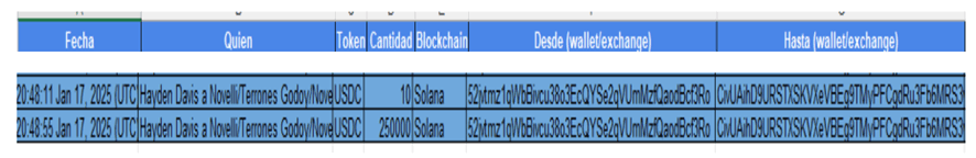Luego, el 17 de enero, la misma billetera recibió USDC 250.000, en dos pagos. Esto coincide exactamente con los montos y fechas mencionados en el borrador del acuerdo.