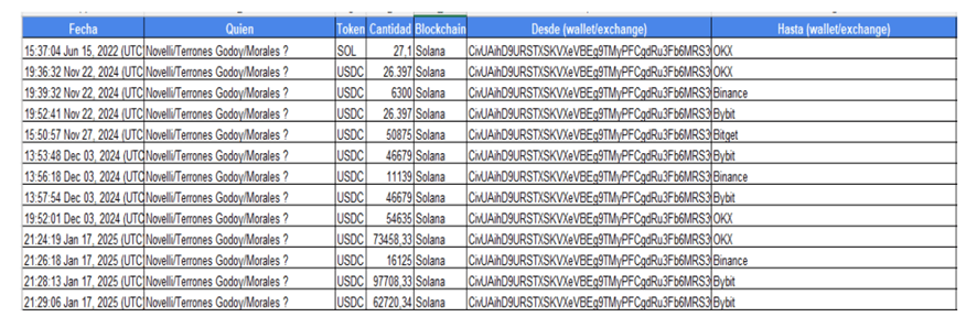 Los documentos entregados por las plataformas Binance, Exchange OKX y Bybit, permitieron rastrear movimientos sospechosos en billeteras virtuales pertenecientes a Mauricio Novelli, Manuel Terrones Godoy y Sergio Morales. Binance sólo pudo dar datos de residentes argentinos. Aún falta aportar más datos.