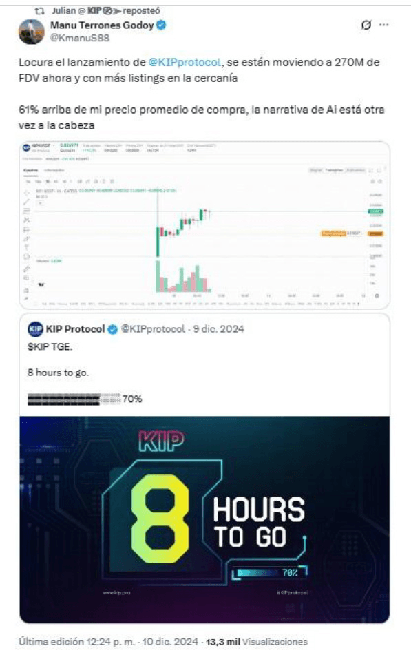 El día mismo del lanzamiento de $KIP, el 10 de diciembre de 2024, a las 7:21 AM (hora de Argentina), Manuel Terrones Godoy recibió 6.750.000 tokens de la moneda digital $KIP, e inmediatamente los transformó a USDT. Apenas dos minutos después comenzó a vender los tokens $KIP, liquidando aproximadamente 755.000 $KIP antes del mediodía. A las 12:24 PM, Manuel Terrones Godoy publicó un posteo en X promoviendo KIP Protocol, mostrando el alza que él mismo estaba generando como una prueba del éxito de la cripto.