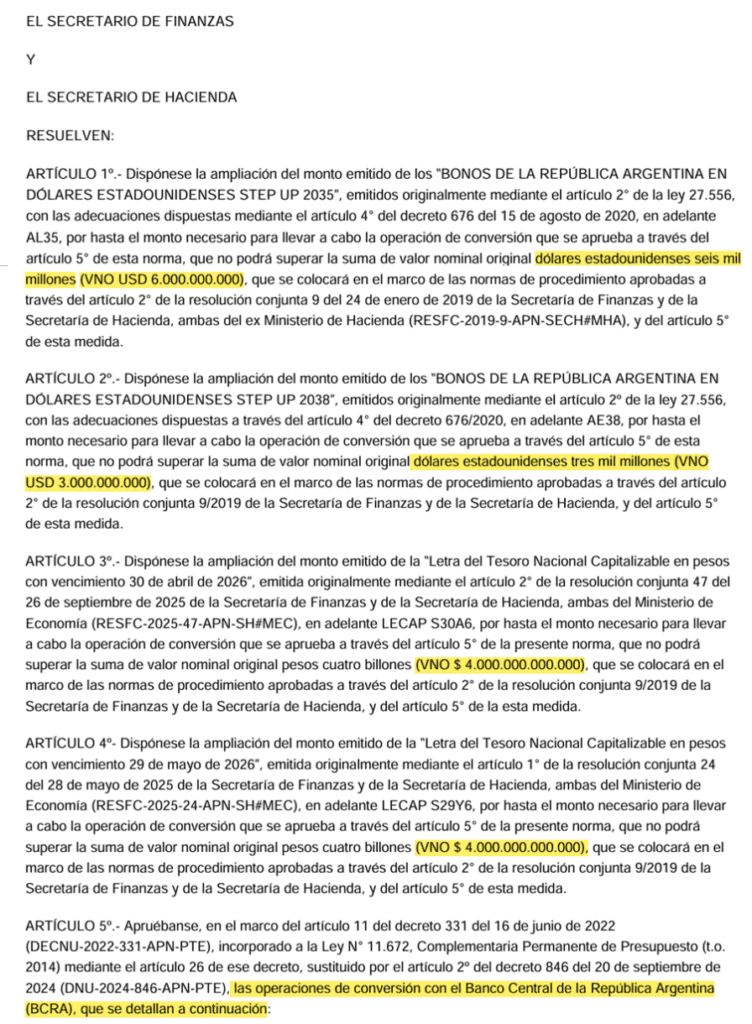 Más allá de esos siderales montos, lo precipitado y desprolijo de la operación quedaba patente al expresar a continuación: “Las operaciones de conversión se realizarán de acuerdo con las siguientes condiciones: Fecha de realización de la operación: 26 de diciembre de 2025. Fecha de liquidación de la operación: 29 de diciembre de 2025”. O sea que escandalosamente, la operación ya se había concretado antes de ser autorizada por parte de esos funcionarios.