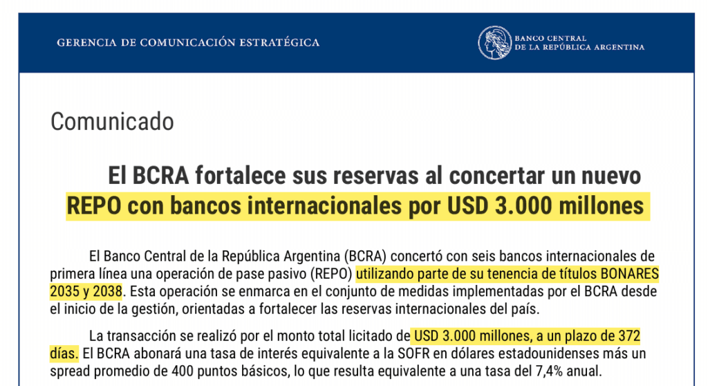 Con el “utilizando parte” como se verá, procuraba disimular que se los relacionara con los USD 9.000 millones del canje concretado con el Tesoro días previos. Y más adelante agregaba: “La transacción se realizó por el monto total licitado de USD 3.000 millones, a un plazo de 372 días. El BCRA abonará una tasa de interés equivalente a la SOFR en dólares estadounidenses más un spread promedio de 400 puntos básicos, lo que resulta equivalente a una tasa del 7,4% anual”.