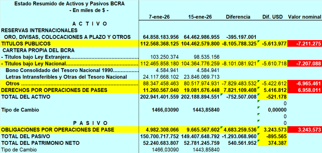 Por eso los márgenes de garantía, o sea la cantidad nominal de los bonos entregados, son siempre muy amplios, para cubrir las pérdidas que podría ocasionar la baja de precios de esos bonos. Tal como sucedió con esta ruinosa REPO de los Caputo Bausili, que se puede comprobar con un simple análisis de los balancetes semanales del BCRA, correspondientes al 7 de enero 2026, antes de la concreción de la REPO, y al 15 de enero 2026 después de ella.