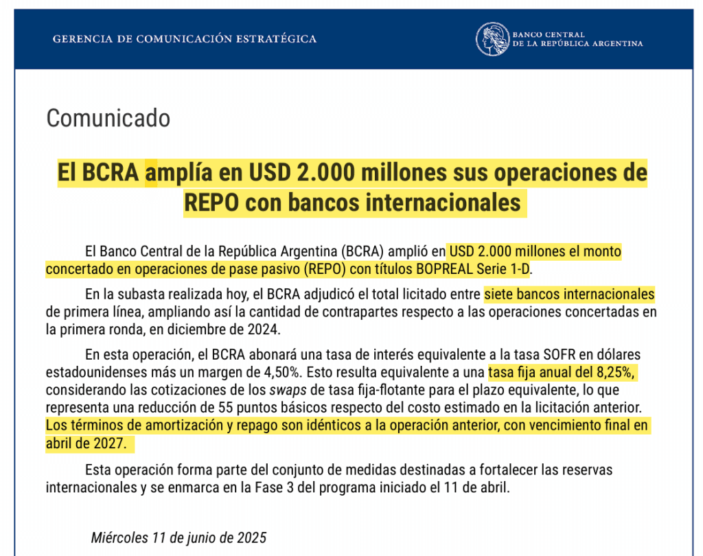 Previamente el 11 de junio pasado, el BCRA presidido por Bausili también había mandado una operación de REPO parecida. Es día anunció que “El BCRA amplió en USD 2.000 millones el monto concertado en operaciones de pase pasivo (REPO) con títulos BOPREAL Serie 1-D. En la subasta realizada hoy, el BCRA adjudicó el total licitado entre siete bancos internacionales de primera línea.”