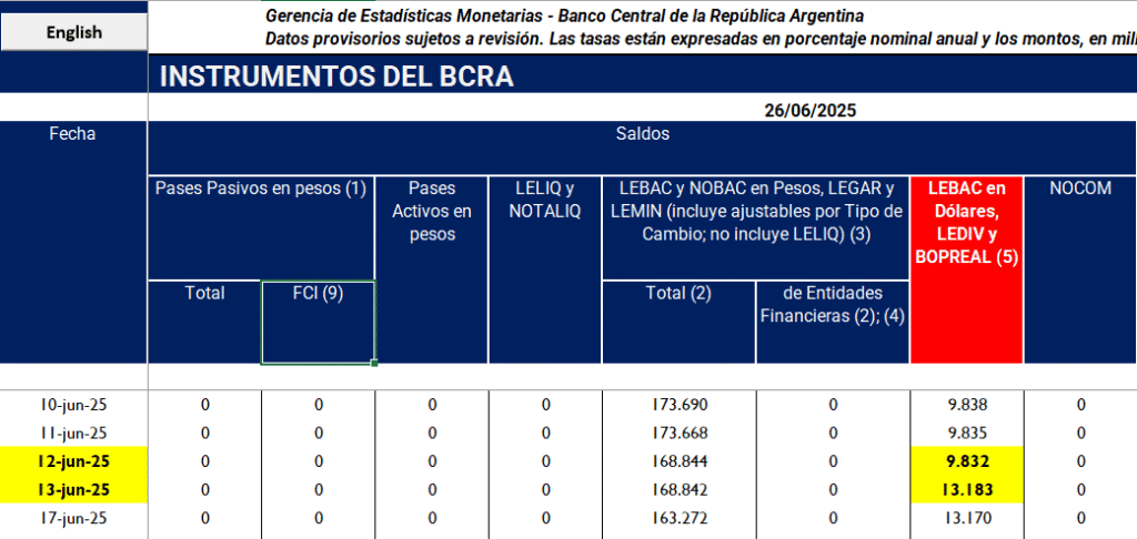 Al respecto, el Informe Monetario Diario del BCRA, revela que entre el 12 y 13 de junio, fecha en que se liquidó la REPO, el monto de Bopreal emitidos pasaron de USD 9.832 a USD 13.183, o sea un aumento de USD 3.351 millones. Pero conforme la nota (5) que se advierte en la siguiente imagen, esos montos esta valuados a precios de mercado, y cotizaban en esas fechas a alrededor del 96 %.