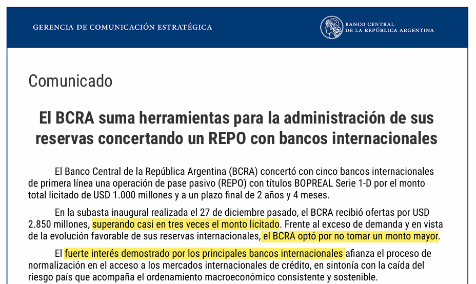 “En la subasta inaugural realizada el 27 de diciembre pasado, el BCRA recibió ofertas por USD 2.850 millones, superando casi en tres veces el monto licitado. Frente al exceso de demanda y en vista de la evolución favorable de sus reservas internacionales, el BCRA optó por no tomar un monto mayor. El fuerte interés demostrado por los principales bancos internacionales afianza el proceso de normalización en el acceso a los mercados internacionales de crédito, en sintonía con la caída del riesgo país que acompaña el ordenamiento macroeconómico consistente y sostenible.”
