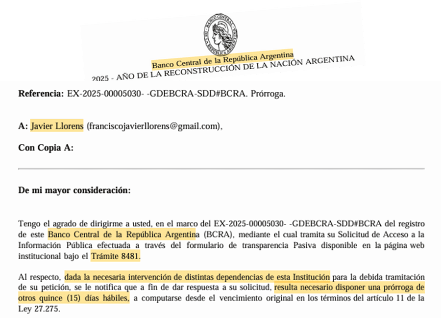Recién el 27 de enero obtuve una “no respuesta” por parte del BCRA, dado que en vez de informar algo tan simple, se me dijo que se renovaba el plazo de quince días hábiles para brindarla, “dada la necesaria intervención de diversas dependencias de esta Institución para la debida tramitación de su petición”, tal como se puede apreciar seguidamente.