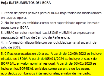 Y en la hoja adyacente NOTAS, esa llamada concretamente dice, entre otras cosas resaltadas en el área amarilla: “A partir del 05/01/2024 se incluye el stock de BOPREAL, en valor nominal residual. A partir del 03/01/2025 se incluyen los BOPREAL emitidos como garantía de los pases acordados con bancos internacionales, a valor de mercado.