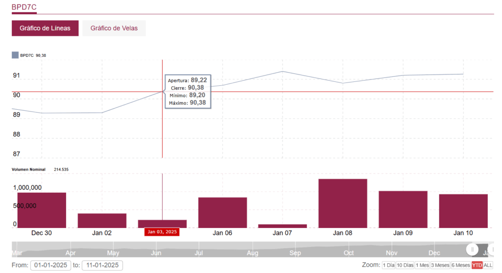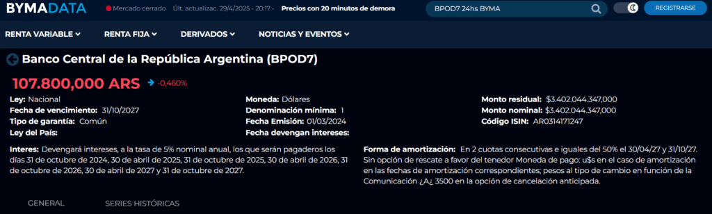 A continuación como parte del engaño, que ponía de relieve la existencia de este agregaba, “esta información puede ser encontrada en los siguientes links”. Remitiendo arteramente el primero de ellos a la cotización del BOPREAL BPOD7, pero no en dólares, sino en pesos. Donde cómo se puede ver en él, en lugar de alrededor del 90 % que era su cotización en dólares, en pesos registraba por entonces un precio del alrededor del 105 %.