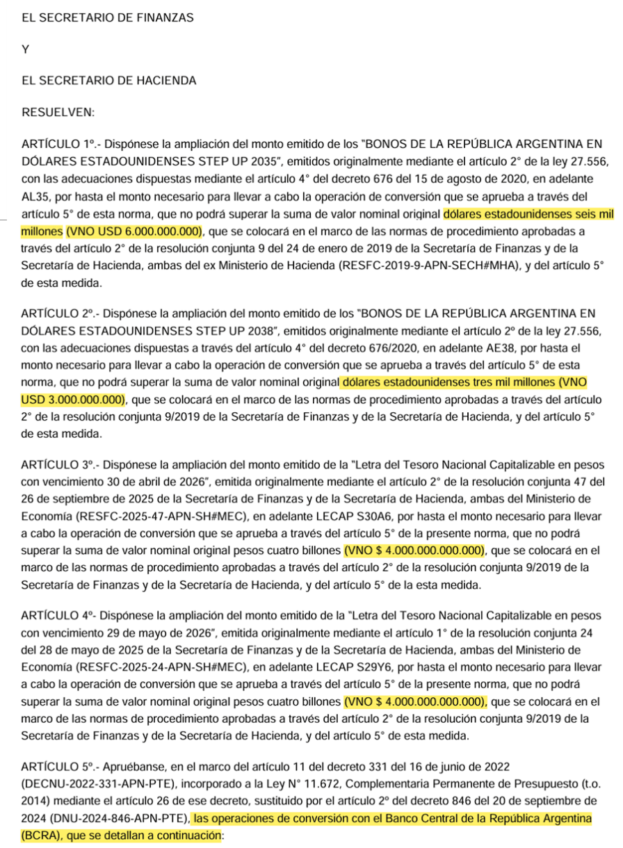 Más allá de esos siderales montos, lo precipitado y desprolijo de la operación quedaba patente al expresar a continuación: “Las operaciones de conversión se realizarán de acuerdo con las siguientes condiciones: Fecha de realización de la operación: 26 de diciembre de 2025. Fecha de liquidación de la operación: 29 de diciembre de 2025”. O sea que escandalosamente, la operación ya se había concretado antes de ser autorizada por parte de esos funcionarios.