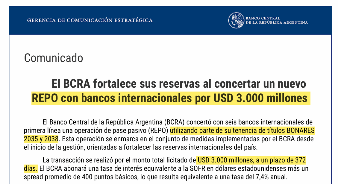 “El Banco Central de la República Argentina (BCRA) concertó con cinco bancos internacionales de primera línea una operación de pase pasivo (REPO) con títulos BOPREAL Serie 1-D por el monto total licitado de USD 1.000 millones y a un plazo final de 2 años y 4 meses.”