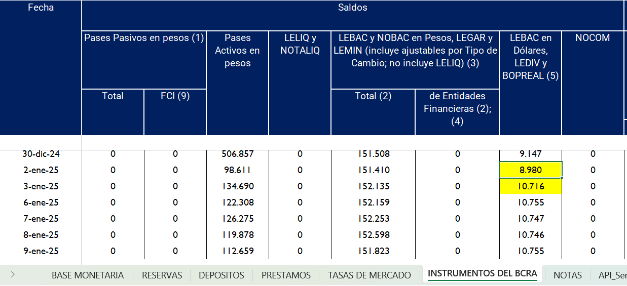Y en la hoja adyacente NOTAS, esa llamada concretamente dice, entre otras cosas resaltadas en el área amarilla: “A partir del 05/01/2024 se incluye el stock de BOPREAL, en valor nominal residual. A partir del 03/01/2025 se incluyen los BOPREAL emitidos como garantía de los pases acordados con bancos internacionales, a valor de mercado.