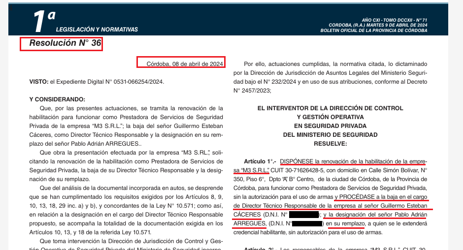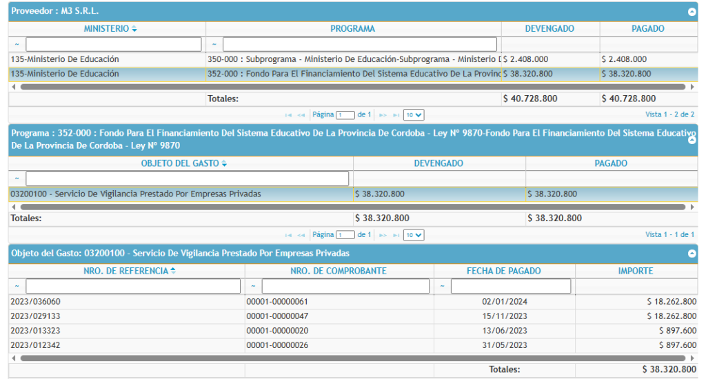 Según el Portal de Transparencia, donde el estado provincial cordobés publica las erogaciones presupuestarias, M3 SRL inició sus contratos con la administración pública en la cartera del Ministerio de Educación a partir del año 2022, en el penúltimo año del mandato de Juan Schiaretti como gobernador. Allí facturó $8,2 millones para “atender servicio de vigilancia destinado a establecimientos educativos”. Es el equivalente aproximado a unos U$S 60 mil a valor oficial de entonces.