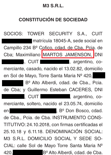 La empresa M3 SRL fue creada en el año 2018, inicialmente por tres socios: los comerciantes Guillermo Esteban Cáceres y Maximiliano Martos Jamenson, junto otra entidad empresarial llamada Tower Security SA. El domicilio inicial fue el mismo que el personal de Martos Jamenson: un departamento de la Torre Santa María, ubicado en barrio Alto Alberdi de la ciudad de Córdoba, en el primer piso.