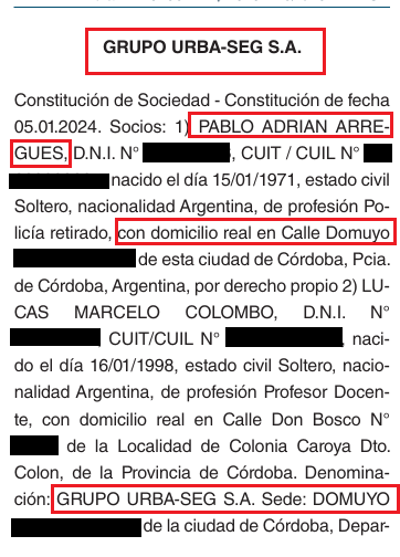 Grupo Urba-Seg SA fue creada a comienzos de 2024, por el exsubjefe de la Policía Pablo Arregues. A pesar de que tres meses después pasó a ocupar el cargo de Director Técnico Responsable de M3 SRL, la empresa supuestamente competidora propiedad de Maxi Martos Jamenson.