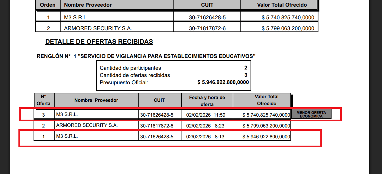 La empresa en cuestión se llama M3 SRL Seguridad Privada. Y sí: es la misma empresa que acaba de ganar un nuevo concurso para proveer la vigilancia en los establecimientos educativos, a pesar qué su historial pone en duda que lo haya hecho plenamente. Ahora, se le suma esta extraña maniobra de la última subasta, que tiene un eco al escándalo de la empresa Techint, en su frustrado intento por ganar la licitación de un gran gasoducto, presentando una segunda oferta más económica, pidiendo además que se le permita mejorar la mejor oferta existente. A diferencia del multimillonario Paolo Rocca, la misteriosa compañía M3 logró ambas cosas sobre la hora, y se quedó con la presa apetecida.