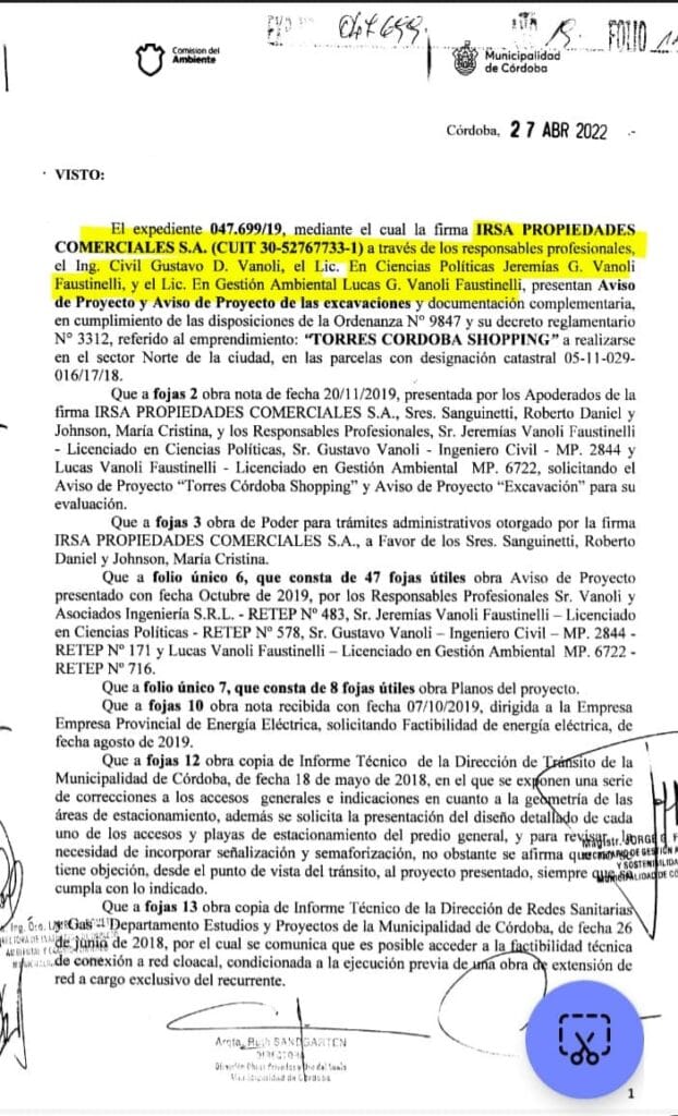 Lo concreto es que uno de los encargados de poner la firma para poner en marcha las torres de IRSA- PROACO en el shopping de Villa Cabrera fueron nada más ni nada menos que Vanoli y Asociados, directamente vinculados a los Faustinelli. Esta consultora es conocida también por realizar los estudios de impacto ambiental en otras obras muy cuestionadas en la provincia de Córdoba, como la nueva traza del Camino del Cuadrado, el country El Terrón de Mendiolaza de Manuel Tagle y el nuevísimo parque acuático Infinito Water Park cuya crítica publicó este portal.