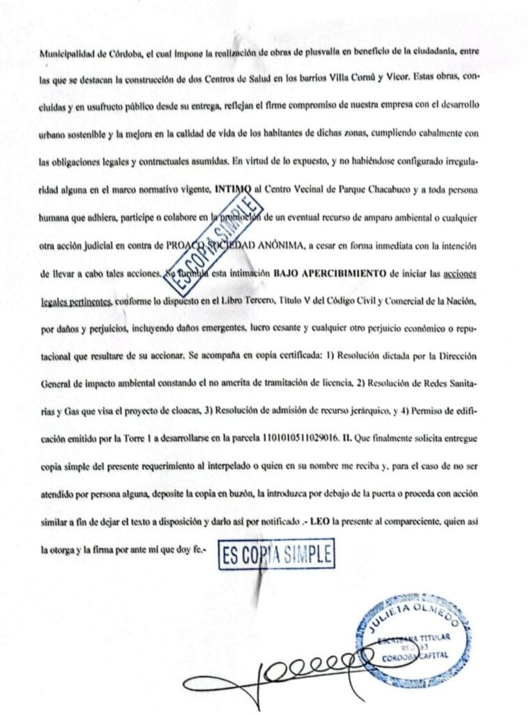 Como respuesta a la visibilidad que cobró el reclamo, Salim, sabiendo quizás que todo su convenio urbanístico DUO lleno de irregularidades, está prendido con alfileres, absurdamente intimó judicialmente, al centro vecinal de Parque Chacabuco y “toda persona humana” para hacer cesar de manera inmediata cualquier pedido de “recurso de amparo ambiental” u otra acción judicial que se quiera hacer respecto al emprendimiento de IRSA-PROACO.
