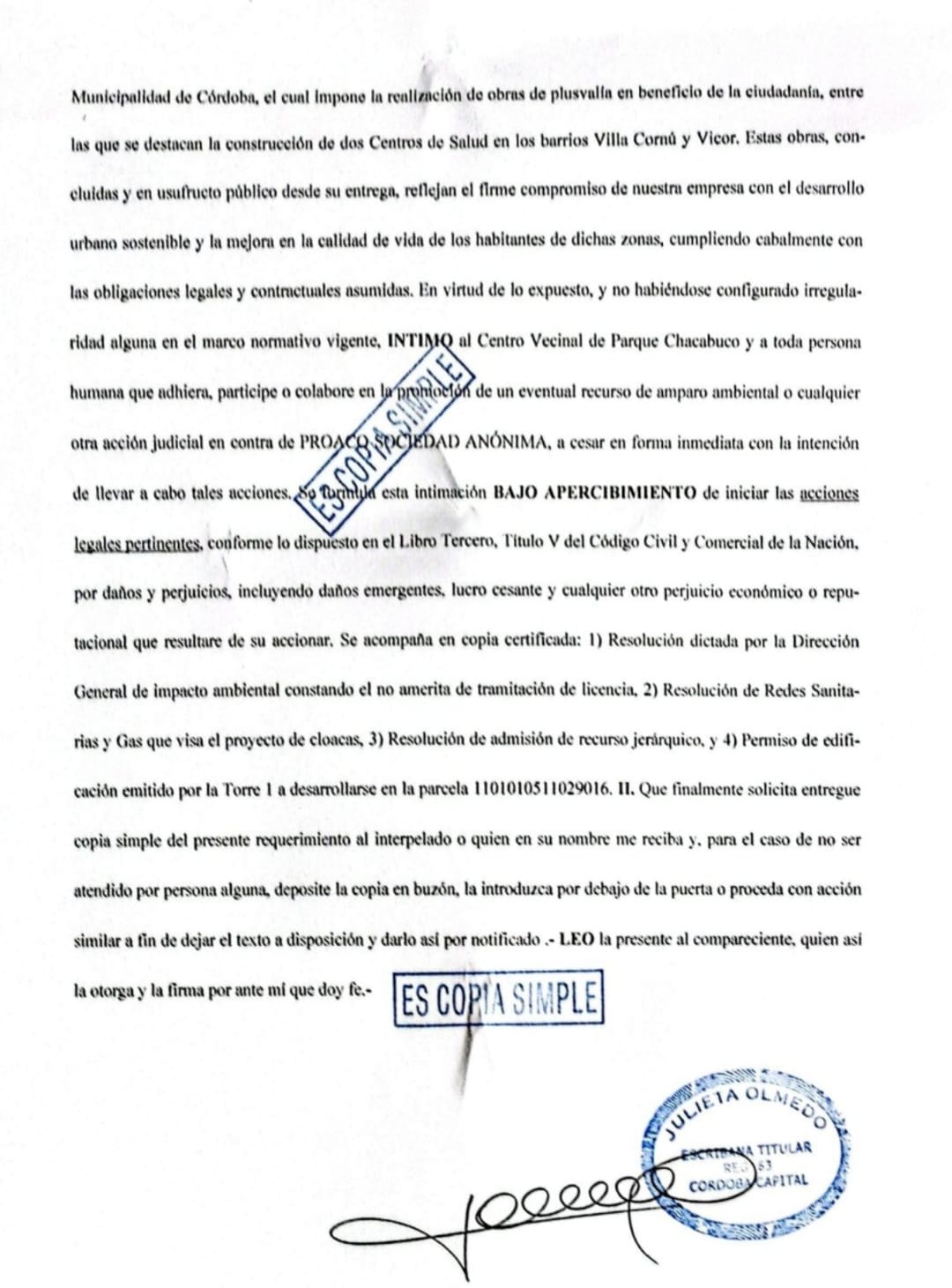 Textualmente la curiosa intimación, con la torpe intención de intimidar, decía: “INTIMO al Centro Vecinal de Parque Chacabuco y a toda persona humana que adhiera, participe o colabore en la promoción de un eventual recurso de amparo ambiental o cualquier otra acción judicial en contra de PROACO SOCIEDAD ANÓNIMA, a cesar en forma inmediata con la intención de llevar a cabo tales acciones” dice textualmente el escrito enviado por Salim “ BAJO APERCIBIMIENTO de iniciar las acciones legales pertinentes”.