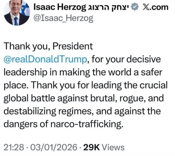El día de la caída de Maduro, Isaac Herzog felicitó a Donald Trump en su cuenta oficial de X por “hacer del mundo un lugar más seguro” en una batalla global contra los “regímenes brutales y desestabilizadores”.