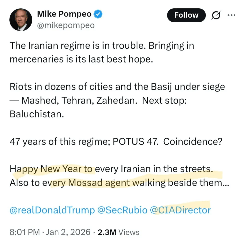 Con el estilo de desparpajo propio del trumpismo, el ex Secretario de Estado durante la primera presidencia de Trump, Mike Pompeo, escribió en X un posteo que comenzaba diciendo “El régimen iraní está en problemas…. Disturbios en docenas de ciudades y el Basij bajo asedio” y cerraba “Feliz Año Nuevo a cada iraní en las calles. También a cada agente del Mossad caminando junto a ellos…”.