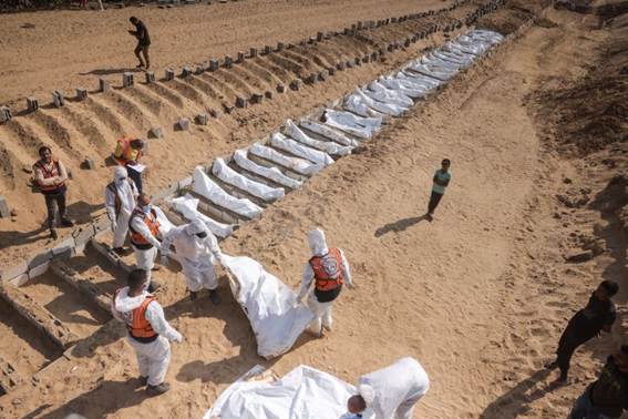 En abril de 2024, el Alto Comisionado de las Naciones Unidas para los Derechos Humanos, Volker Türk, señaló el descubrimiento de fosas comunes en los hospitales Al-Shifa y Nasser, que contenían cientos de cadáveres, entre ellos de mujeres, ancianos y heridos. Algunos fueron encontrados atados y desnudos, lo que suscitó serias preocupaciones por posibles violaciones graves del derecho internacional humanitario.