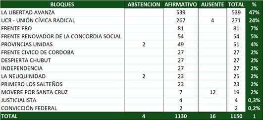 El siguiente cuadro muestra como LLA logró la aprobación de dicho proyecto de ley, en general, y mediante la aprobación de sus 26 títulos a título cerrado, modalidad impuesta por el oficialismo. Acorde la arenga que pronunció Karina Milei a sus legisladores, de que en los proyectos de LLA “primero se los vota y luego se los lee”.