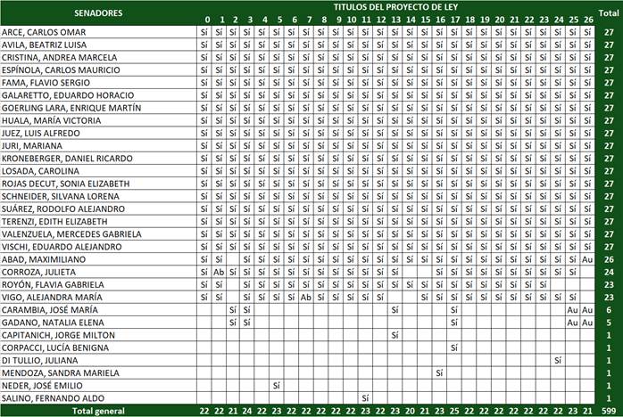 En el siguiente cuadro está el listado de los/as senadores/as que aportaron para esa sanción, ya sea su voto por el Sí, Abstención, o Ausencia. Distinguiéndose en primer lugar los 18 senadores NO LLA Arce, Avila, Cristina, Espínola, Fama, Galaretto, Goerling, Huala, Juez, Juri, Kroneberger, Losada, Rojas Decut, Schneider, Suárez, Terenzi, Valenzuela, y Vischi, que profesando un karinismo carnal, le dijeron Sí, Sí, Sí, Sí, Sí, Sí … a todo, váyase a saber con qué impulso oculto.