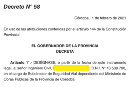 Situación que cambió en febrero 2021, donde según el boletín oficial de la provincia fue designado Subdirector de Seguridad Vial dependiente del Ministerio de Obras Públicas de Córdoba.