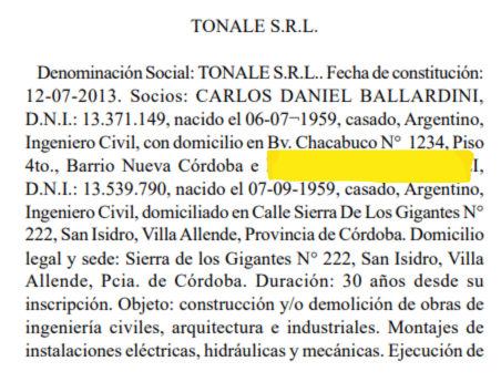 Otro dato llamativo es que si bien está constituida en Misiones, la empresa ASCON S.R.L tiene domicilio en Córdoba capital.