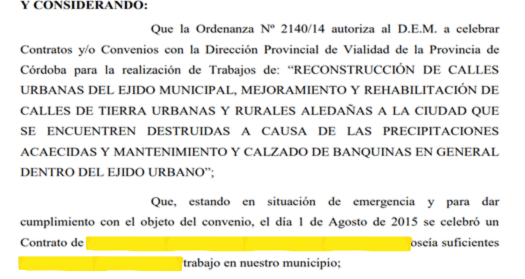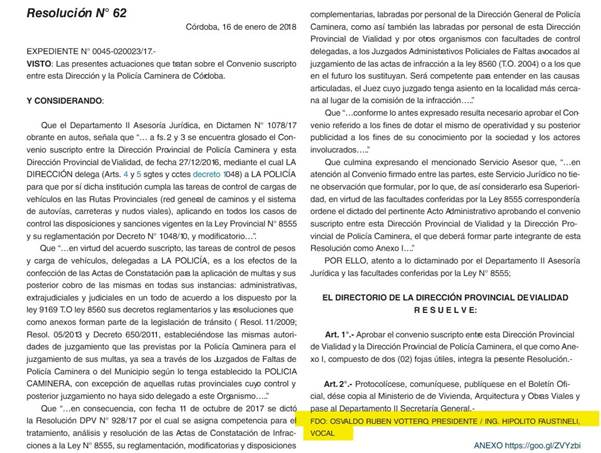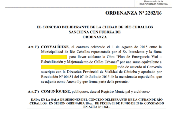 Aunque la fecha del convenio haya sido el día 1 de agosto del 2015 (y aparentemente Faustinelli asumió como Director de Vialidad Provincial en diciembre de ese año) lo interesante de este dato es que, según lo que aparece en el documento, el artículo 1 de la ordenanza con fecha del 1 de junio del año 2016, convalidó el pago por “Pesos Un Millón Quinientos Mil ($1.500.000,00) todo de acuerdo al Convenio suscripto con la Dirección Provincial de Vialidad de Córdoba”.
