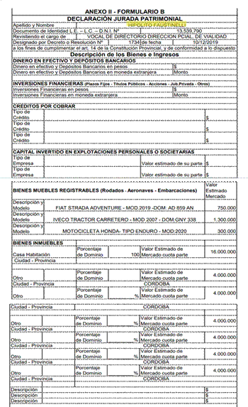 Según la Declaración Jurada de bienes presentada ante la provincia con fecha del 10 de diciembre del año 2019, Faustinelli (que ya había sido dos veces intendente en Río Segundo, ministro en Corrientes, legislador, diputado nacional, director de Vialidad y poseía al menos una empresa a su nombre) solamente declaró poseer en bienes muebles registrables: una FIAT STRADA, un TRACTOR CARRETERO, y una MOTOCICLETA, por un valor de $300.000.-