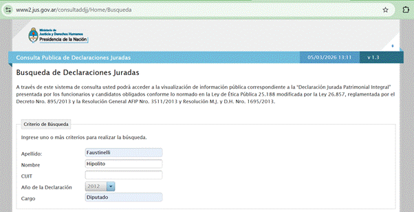 Es importante resaltar que, al buscar declaraciones juradas de Faustinelli para observar la evolución de sus bienes, tanto en su cargo como ministro de Corrientes, diputado en el Congreso Nacional, o Legislador de Córdoba, únicamente está publicada la declaración jurada anteriormente expuesta. No se puede acceder a otra información sobre su patrimonio, lo que resulta un escándalo dado a la cantidad de cargos que ha tenido en el Estado. Y ahora al pasar en el escalafón de director a subdirector, ha quedado desobligado de presentar las molestas Declaraciones Juradas de Bienes.