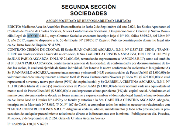 ASCON S.R.L. es una empresa constructora creada en 2017 “para diseñar, asesorar y ejecutar obras viales e hidráulicas” según detalla su propia página web. Sin embargo, lo llamativo es qué según Google, el acta constitutiva y los movimientos de dicha empresa figuran en el boletín digital de la provincia de Misiones (¿recuerdan que Faustinelli estuvo muchos años en el litoral?).