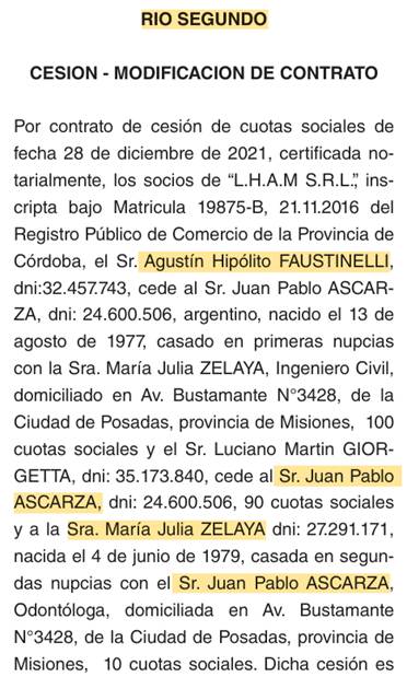 Pero… ¿adivine cuáles nombres figuran junto al de Juan Pablo Ascarza como “socios”? el de Agustín Hipólito Faustinelli, hijo de Hipólito Faustinelli y el de Luciano Martín Giorgetta, casado con Eugenia Gabriela Faustinelli, hija de Hipólito. En resumen: se evidencia algo sumamente importante, que el dueño de ASCON S.R.L., la empresa que construyó obras públicas junto al municipio de Río Segundo durante la gestión del intendente schiarettista Darío Chesta, está vinculada con los Faustinelli.