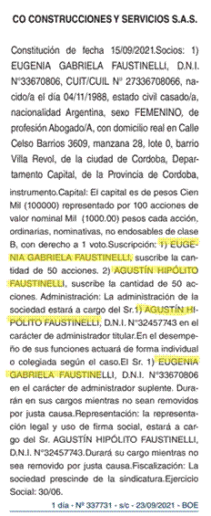 Eugenia Faustinelli es abogada y su hermano Agustín aparece como comerciante. Pero, al parecer, eso no les impide ser accionistas de la firma CO CONSTRUCCIONES Y SERVICIOS S.A.S. según aparece en el boletín oficial de la provincia de Córdoba con fecha de 23 de septiembre de 2021.