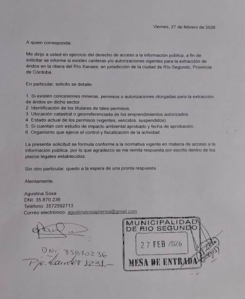 Por esta razón, ejerciendo el derecho al acceso a la información pública, la autora de esta nota ingresó un pedido por mesa de entrada de la Municipalidad de Río Segundo, para saber si existen canteras en este momento extrayendo arena en las inmediaciones al río Xanaes; si las mismas están registradas en Minería de la Provincia; si hay estudios de impacto ambiental; y demás precisiones.