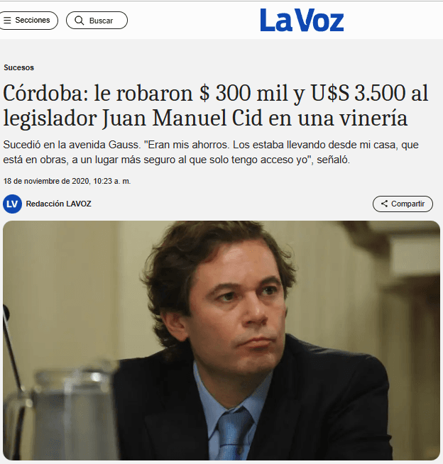 «Eran ahorros, los llevaba a otro lugar. Me llevaron todo», agregó Cid, a esa radio amiga, sin que nadie entendiera que hacía el legislador, en pleno encierro de la pandemia, con siete mil dólares arriba entrando a una vinería a la mañana.