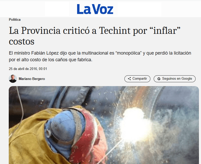En 2016, frente a ese escenario, el ministro López tuvo que agarrar su calculadora y anotador para intervenir en los medios de comunicación ante ese raid fuera de cálculo contra el rey del acero: “El año pasado [NdR: se refiere a 2015], la tonelada de caños costaba US$ 2.500, pero hoy [mediados de 2016] cuesta US$ 1.500 en el mercado internacional. Estamos hablando de 52.000 toneladas, hay US$ 52 millones en juego. Hagan el lobby que quieran, no vamos a pagar un centavo más” replicó López, por entonces ministro de Agua, Ambiente y Servicios Públicos de Córdoba, máximo responsable de las obras. “Córdoba no va a defender el monopolio” completó el gobernador Juan Schiaretti en lo que parecía iba a ser un duro enfrenamiento.
