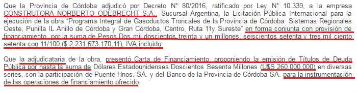 Resuelto el affaire con Techint, Schiaretti y López tuvieron que resolver el próximo paso: el financiamiento externo para solventar estas obras. El 13 de septiembre del 2016, el gobernador de Córdoba firmó el decreto 1250/16, autorizando la emisión de un título público por US$ 260 millones -lo mismo que salía la obra de 2008- a pagar en 10 años, con una tasa del 7,5%, para financiar solamente las obras que estaban a cargo de Odebrecht.