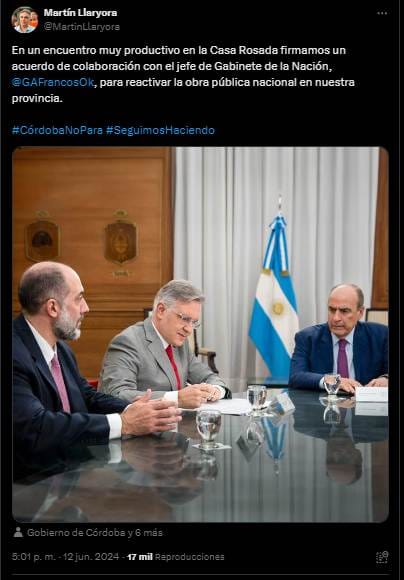 El 11 de junio de 2024, el Senado de la Nación estaba debatiendo la Ley Bases propuesta por el gobierno nacional, la cual se aprobaría esa misma trasnoche. En ese entonces, hubo una fuerte represión policial en las calles porteñas contra quienes se manifestaban contra la ley ómnibus. Mientras eso ocurría, el gobernador de Córdoba, Martín Llaryora, había anunciado una serie de acuerdos con Guillermo Francos, el jefe de Gabinete de ministros de la Casa Rosada de ese entonces.