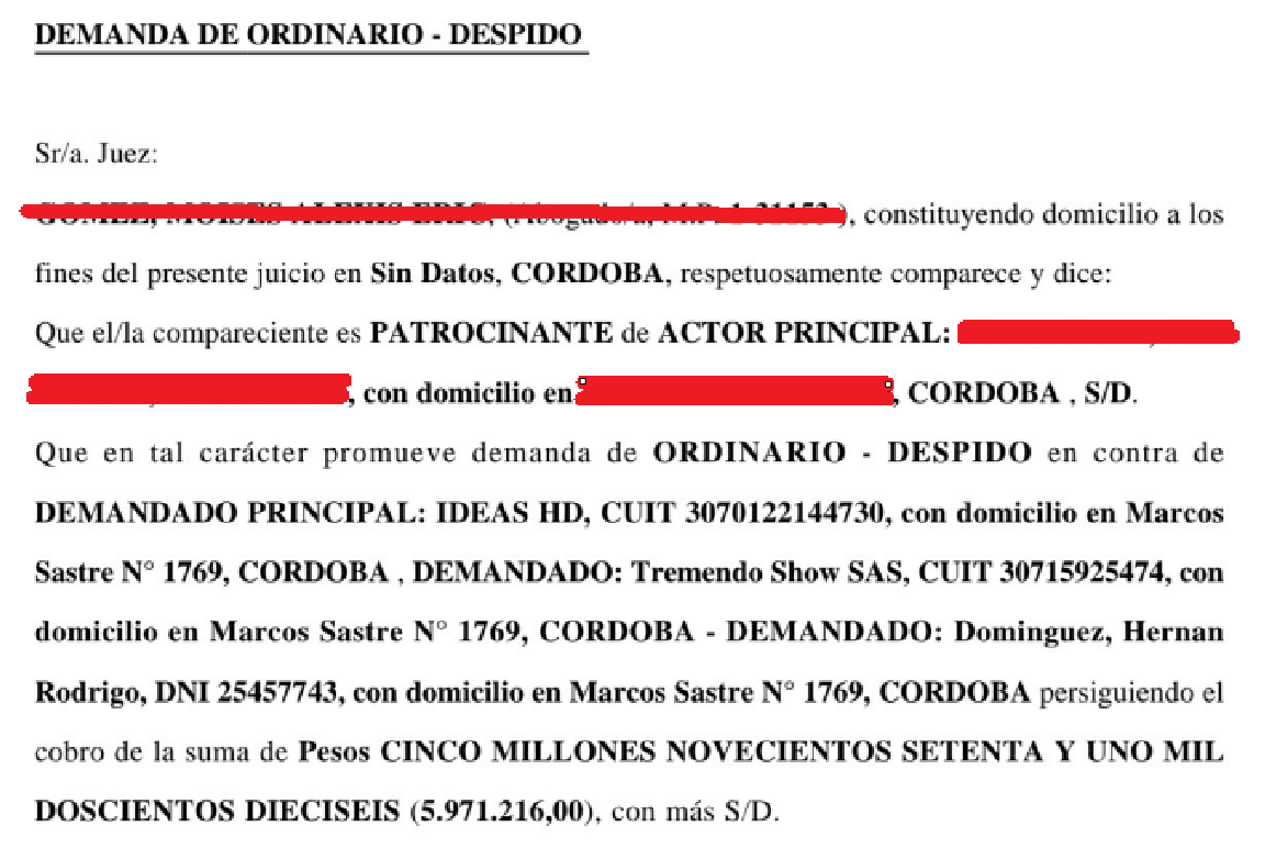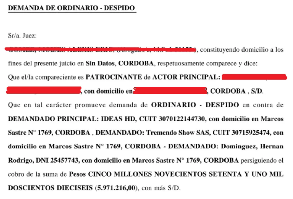 Sin embargo, según consta en las demandas, la baja retribución mensual y las elevadas exigencias laborales, terminaron derivando en su salida de la firma, sin indemnización ni ningún tipo de compensación. Por ello, seguidamente inició una demanda laboral por despido por 5 millones de pesos de entonces, que Dominguez siempre se negó a pagarle.