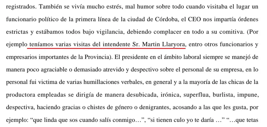 Al respecto, en relación a los vínculos de Dominguez con el actual gobernador de Córdoba, su ex empleada expuso que “tenían varias visitas del (por entonces) intendente Sr. Martín Llaryora, entre otros funcionarios y empresarios importantes de la Provincia”.
