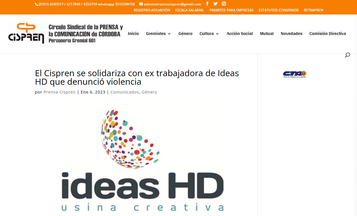 Por estos graves hechos, el 6 de enero del 2023 el Círculo Sindical de la Prensa y la Comunicación de Córdoba (CISPREN) manifestó “su apoyo” a la empleada en un comunicado publicado en la web del sindicato. En el texto, CISPREN “repudia el accionar del directivo de Ideas HD contra la trabajadora” y “reitera la urgente necesidad de contar con espacios laborales libres de violencias para un ejercicio saludable y equitativo del periodismo”.