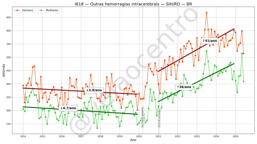 Estadísticas que nos llegan de Brasil indican que, al menos allí, las hemorragias intracerebrales y los infartos de miocardio siguen creciendo luego del evento masivo de vacunación anti-covid.