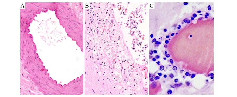 El Dr. Arne Burckhardt realizó autopsias a 43 pacientes fallecidos a los pocos días de aplicarse las vacunas Covid, encontrando una relación indudable entre la aplicación de la dosis y la muerte en 22 de esos casos. En las muestras de tejidos sometidos a histopatología pudo apreciarse vasculitis, con una invasión de linfocitos y macrófagos, que señalan un ataque autoinmune a los vasos sanguíneos.