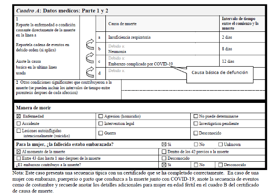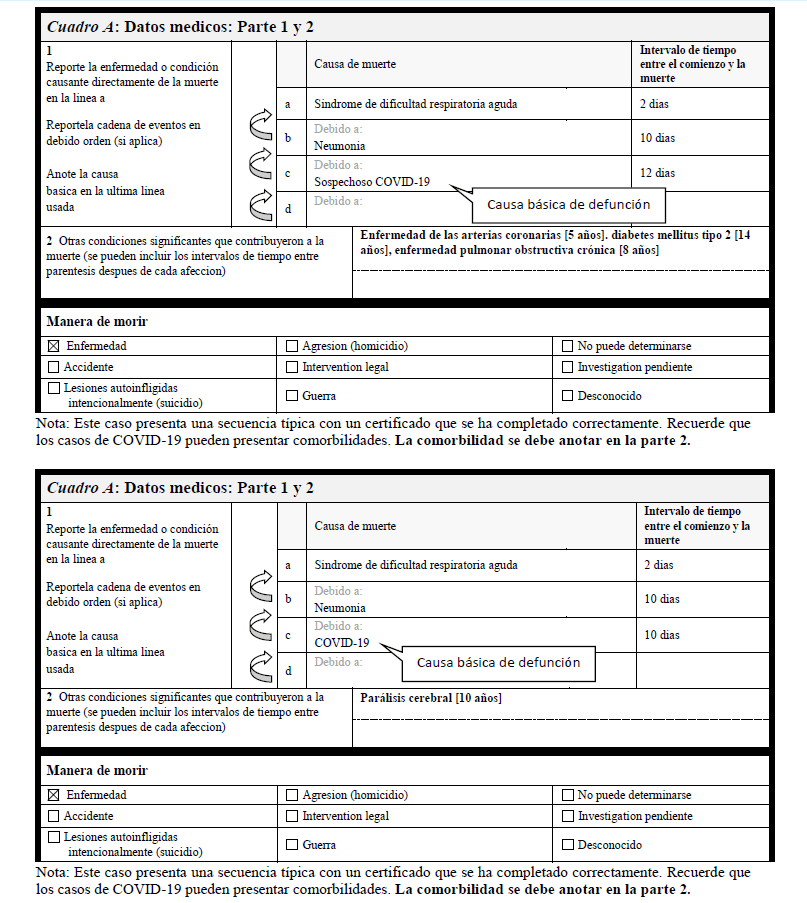 A continuación, podemos ver algunos ejemplos de la manera en que la OMS mandó a redactar las fichas de defunción en los hospitales durante la epidemia de covid-19.
