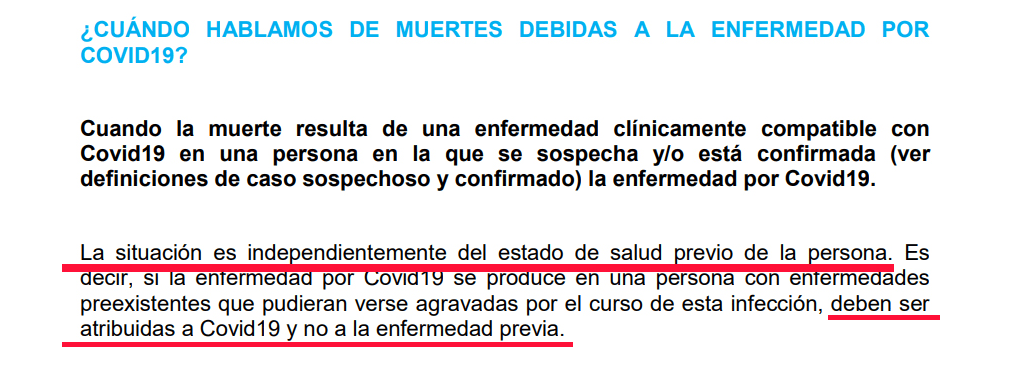 Podemos ver que en estas guías se explicita que si una persona fallecía luego de tener enfermedad de arterias coronarias durante 5 años, enfermedad pulmonar obstructiva crónica durante 8 años, parálisis cerebral durante 10 años, o HIV durante cinco años, pero había dado positivo en el bendito test de Covid (o ni siquiera, simplemente se lo considera “sospechoso de covid”), la causa de muerte que debía figurar en su ficha de defunción era el Covid y no la otra enfermedad.